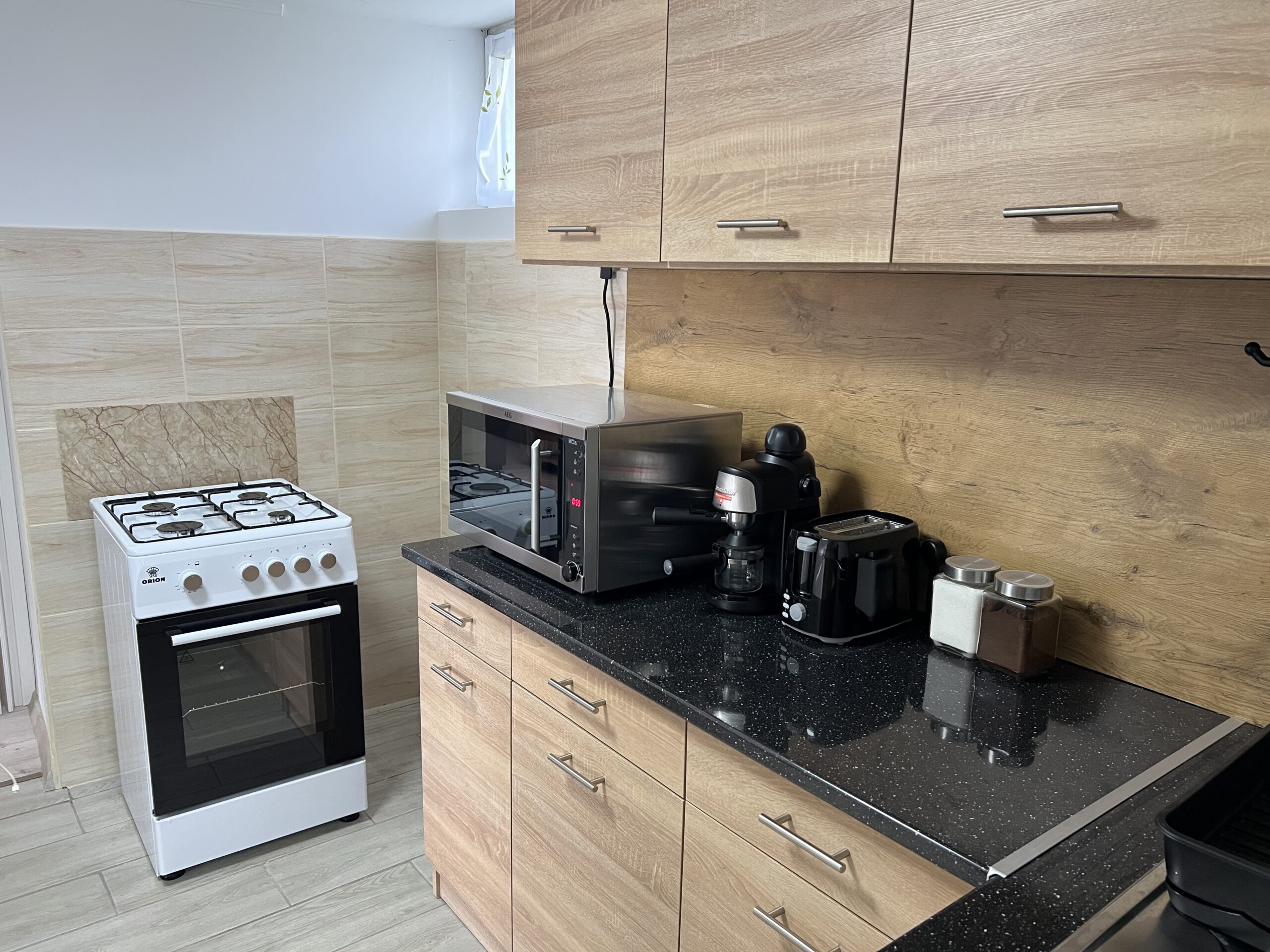 - Teljesen felszerelt konyha: gáztűzhely, sütő, hűtő, mikrohullámú sütő, kenyérpirító, kávéfőző, étkészlet